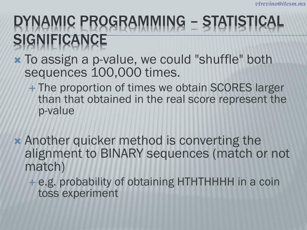 To assign a p-value, we could "shuffle" both sequences 100,000 times. • The proportion of times we obtain SCORES larger than that obtained in the real score represent the p-value • Another quicker method is converting the alignment to BINARY sequences (match or not match) • e.g. probability of obtaining HTHTHHHH in a coin toss experiment Dynamic Programming – Statistical Significance