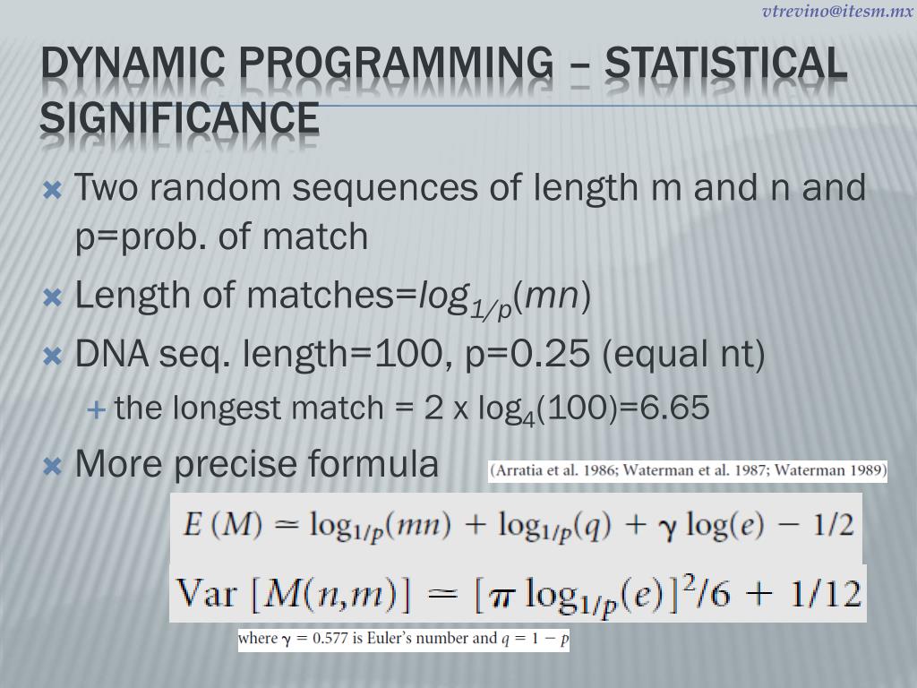 Two random sequences of length m and n and p=prob. of match • Length of matches=log1/p(mn) • DNA seq. length=100, p=0.25 (equal nt) • the longest match = 2 x log4(100)=6.65 • More precise formula Dynamic Programming – Statistical Significance