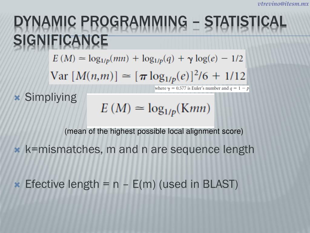 Simpliying k=mismatches, m and n are sequence length Efective length = n – E(m) (used in BLAST) Dynamic Programming – Statistical Significance (mean of the highest possible local alignment score)