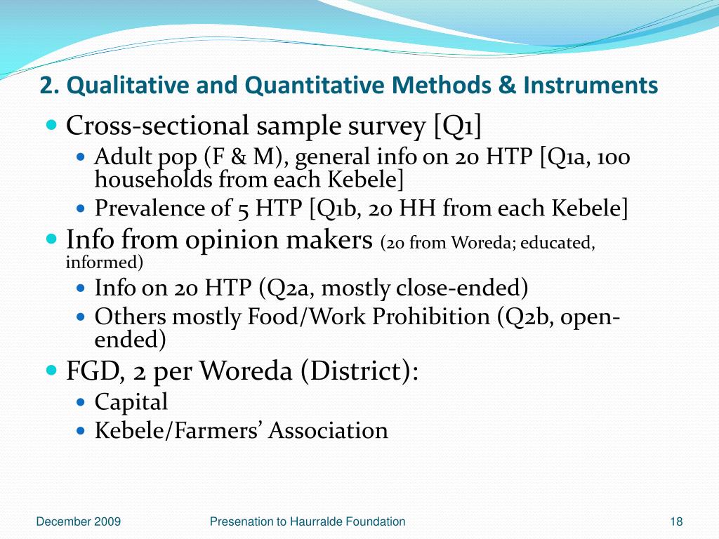 2. Qualitative and Quantitative Methods & Instruments • Cross-sectional sample survey [Q1] • Adult pop (F & M), general info on 20 HTP [Q1a, 100 households from each Kebele] • Prevalence of 5 HTP [Q1b, 20 HH from each Kebele] • Info from opinion makers (20 from Woreda; educated, informed) • Info on 20 HTP (Q2a, mostly close-ended) • Others mostly Food/Work Prohibition (Q2b, open-ended) • FGD, 2 per Woreda (District): • Capital • Kebele/Farmers’ Association Presenation to Haurralde Foundation