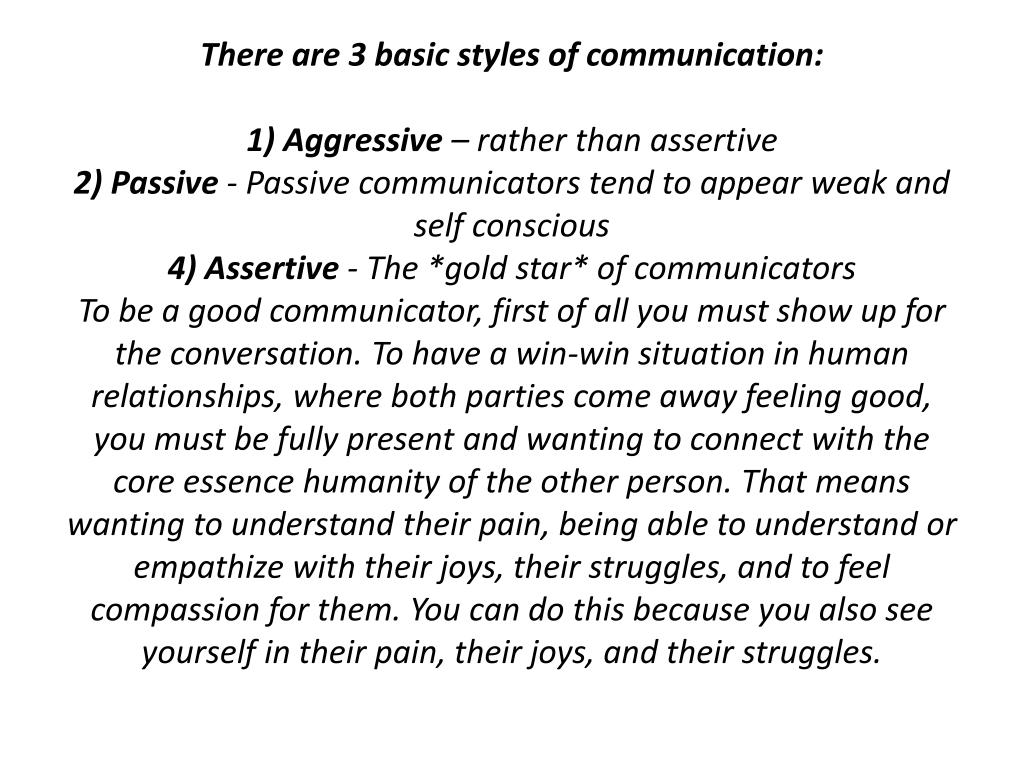 There are 3 basic styles of communication:1) Aggressive – rather than assertive 2) Passive - Passive communicators tend to appear weak and self conscious 4) Assertive - The *gold star* of communicators To be a good communicator, first of all you must show up for the conversation. To have a win-win situation in human relationships, where both parties come away feeling good, you must be fully present and wanting to connect with the core essence humanity of the other person. That means wanting to understand their pain, being able to understand or empathize with their joys, their struggles, and to feel compassion for them. You can do this because you also see yourself in their pain, their joys, and their struggles.