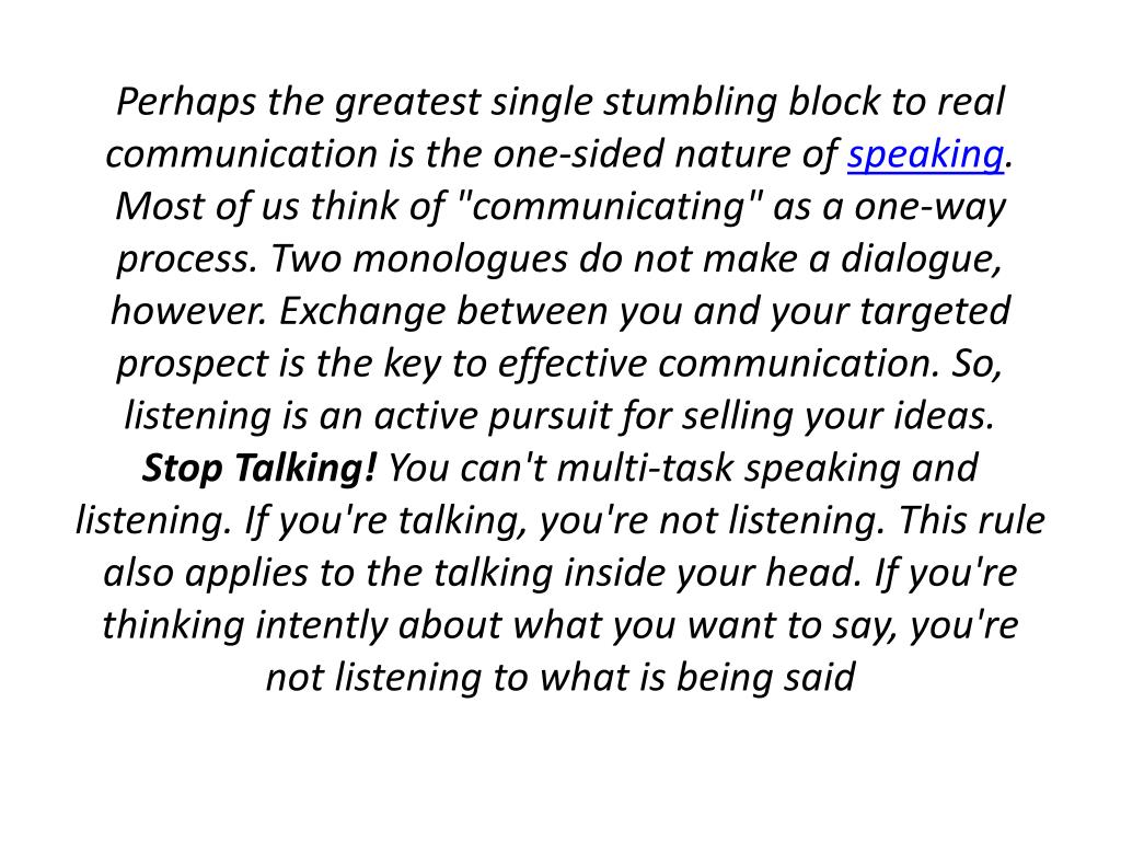 Perhaps the greatest single stumbling block to real communication is the one-sided nature of speaking. Most of us think of "communicating" as a one-way process. Two monologues do not make a dialogue, however. Exchange between you and your targeted prospect is the key to effective communication. So, listening is an active pursuit for selling your ideas.Stop Talking! You can't multi-task speaking and listening. If you're talking, you're not listening. This rule also applies to the talking inside your head. If you're thinking intently about what you want to say, you're not listening to what is being said