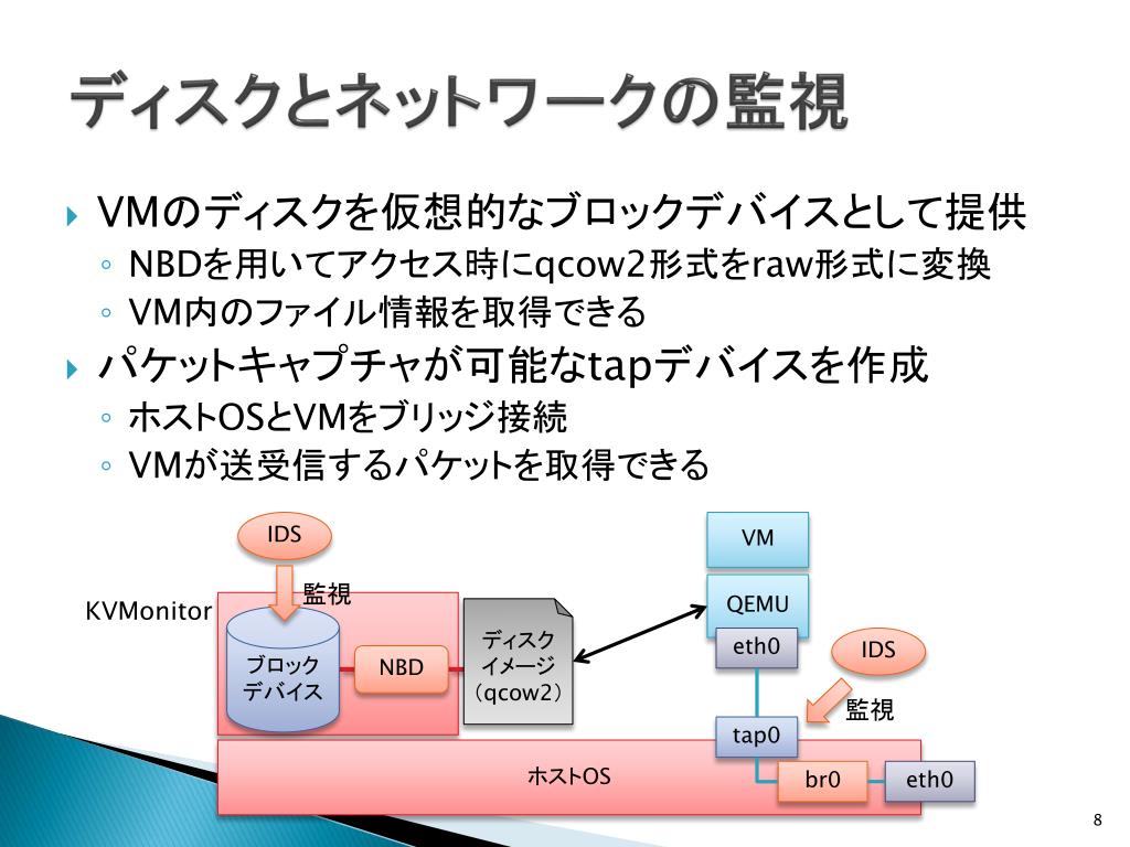 ディスクとネットワークの監視 • VMのディスクを仮想的なブロックデバイスとして提供 • NBDを用いてアクセス時にqcow2形式をraw形式に変換 • VM内のファイル情報を取得できる • パケットキャプチャが可能なtapデバイスを作成 • ホストOSとVMをブリッジ接続 • VMが送受信するパケットを取得できる IDS VM 監視 QEMU KVMonitor ブロック デバイス ディスク イメージ (qcow2) eth0 IDS NBD 監視 tap0 ホストOS br0 eth0