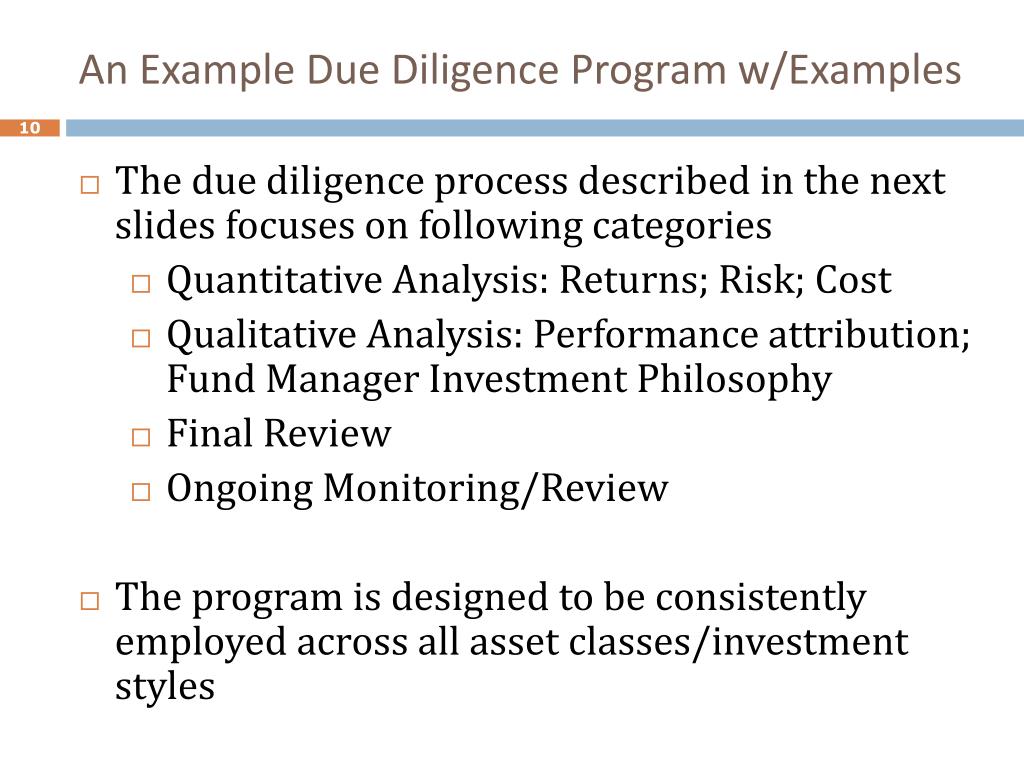 An Example Due Diligence Program w/Examples • The due diligence process described in the next slides focuses on following categories • Quantitative Analysis: Returns; Risk; Cost • Qualitative Analysis: Performance attribution; Fund Manager Investment Philosophy • Final Review • Ongoing Monitoring/Review • The program is designed to be consistently employed across all asset classes/investment styles