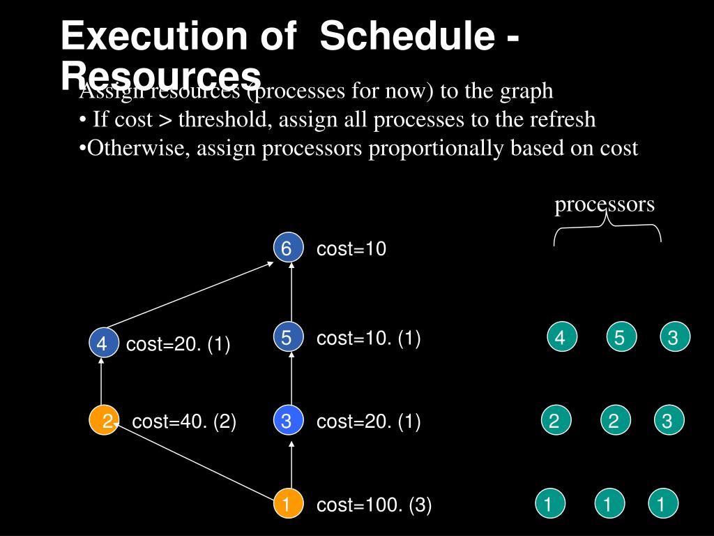 Execution of Schedule - Resources • Assign resources (processes for now) to the graph • If cost > threshold, assign all processes to the refresh processors 6 cost=10 5 cost=10 4 cost=20 2 cost=40 3 cost=20 1 cost=100. (3) 1 1 1