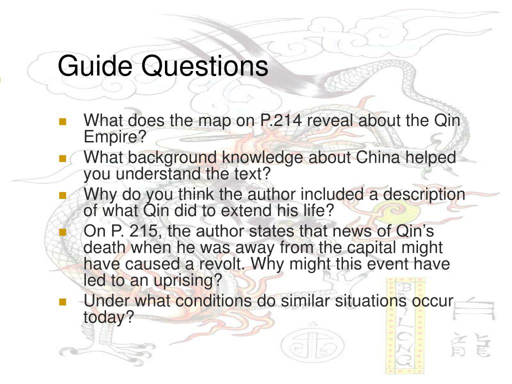 Guide Questions • What does the map on P.214 reveal about the Qin Empire? • What background knowledge about China helped you understand the text? • Why do you think the author included a description of what Qin did to extend his life? • On P. 215, the author states that news of Qin’s death when he was away from the capital might have caused a revolt. Why might this event have led to an uprising? • Under what conditions do similar situations occur today?