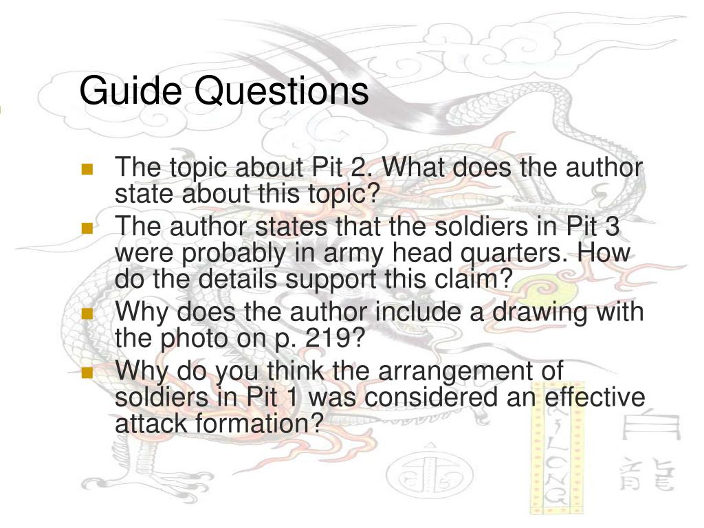 Guide Questions • The topic about Pit 2. What does the author state about this topic? • The author states that the soldiers in Pit 3 were probably in army head quarters. How do the details support this claim? • Why does the author include a drawing with the photo on p. 219? • Why do you think the arrangement of soldiers in Pit 1 was considered an effective attack formation?