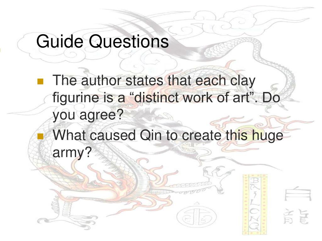 Guide Questions • The author states that each clay figurine is a “distinct work of art”. Do you agree? • What caused Qin to create this huge army?