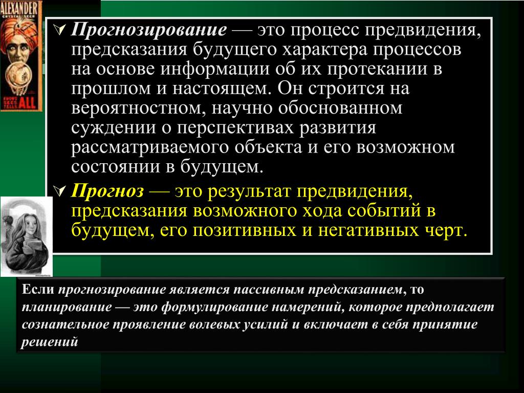 Прогнозирование — это процесс предвидения, предсказания будущего характера процессов на основе информации об их протекании в прошлом и настоящем. Он строится на вероятностном, научно обоснованном суждении о перспективах развития рассматриваемого объекта и его возможном состоянии в будущем. • Прогноз — это результат предвидения, предсказания возможного хода событий в будущем, его позитивных и негативных черт. Если прогнозирование является пассивным предсказанием, то планирование — это формулирование намерений, которое предполагает сознательное проявление волевых усилий и включает в себя принятие решений