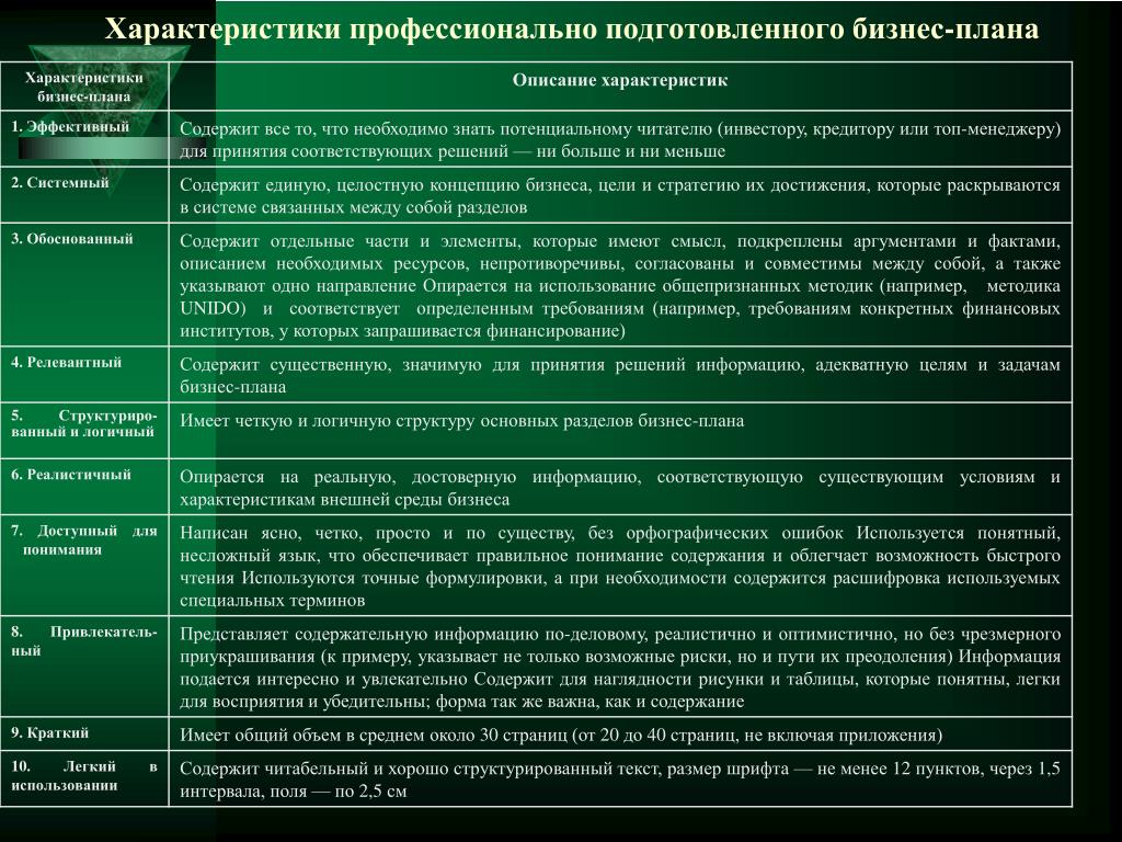 Общие требования к структуре и содержанию бизнес-плана • 1. Исполнительное резюме (Executive Summary). • 2. Анализ рынка (Market Analysis). • 3. Описание компании (Company Descriptions). • 4. Продуктыиуслуги (Products and Services). • 5. Маркетингисбыт (Marketing and Sales Aktivities). • 6. Производство (Operations). • 7. Менеджмент и право собственности (Management and Ownership). • 8. Требуемые средства и их использование (Funds Required and Their Uses). • 9. Финансовые данные (Financial Data). • 10. Приложения или дополнения (Appendices or Exhibits).