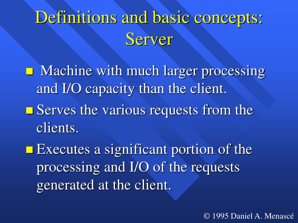 Definitions and basic concepts:Server • Machine with much larger processing and I/O capacity than the client. • Serves the various requests from the clients. • Executes a significant portion of the processing and I/O of the requests generated at the client.