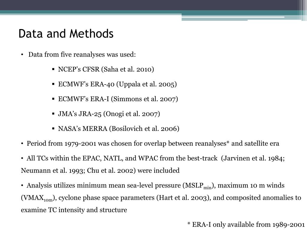 Data and Methods • Data from five reanalyses was used: • NCEP’s CFSR (Saha et al. 2010) • ECMWF’s ERA-40 (Uppala et al. 2005) • ECMWF’s ERA-I (Simmons et al. 2007) • JMA’s JRA-25 (Onogi et al. 2007) • NASA’s MERRA (Bosilovich et al. 2006) • Period from 1979-2001 was chosen for overlap between reanalyses* and satellite era • All TCs within the EPAC, NATL, and WPAC from the best-track (Jarvinen et al. 1984; Neumann et al. 1993; Chu et al. 2002) were included • Analysis utilizes minimum mean sea-level pressure (MSLPmin), maximum 10 m winds (VMAX10m), cyclone phase space parameters (Hart et al. 2003), and composited anomalies to examine TC intensity and structure * ERA-I only available from 1989-2001