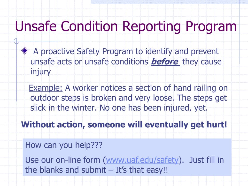 Unsafe Condition Reporting Program • A proactive Safety Program to identify and prevent unsafe acts or unsafe conditions before they cause injury Example: A worker notices a section of hand railing on outdoor steps is broken and very loose. The steps get slick in the winter. No one has been injured, yet. Without action, someone will eventually get hurt! How can you help??? Use our on-line form (www.uaf.edu/safety). Just fill in the blanks and submit – It’s that easy!!