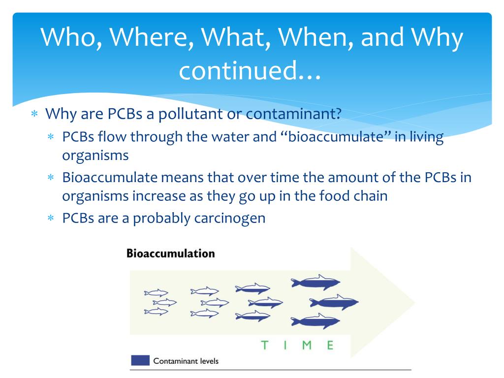 Who, Where, What, When, and Whycontinued… • Why are PCBs a pollutant or contaminant? • PCBs flow through the water and “bioaccumulate” in living organisms • Bioaccumulate means that over time the amount of the PCBs in organisms increase as they go up in the food chain • PCBs are a probably carcinogen