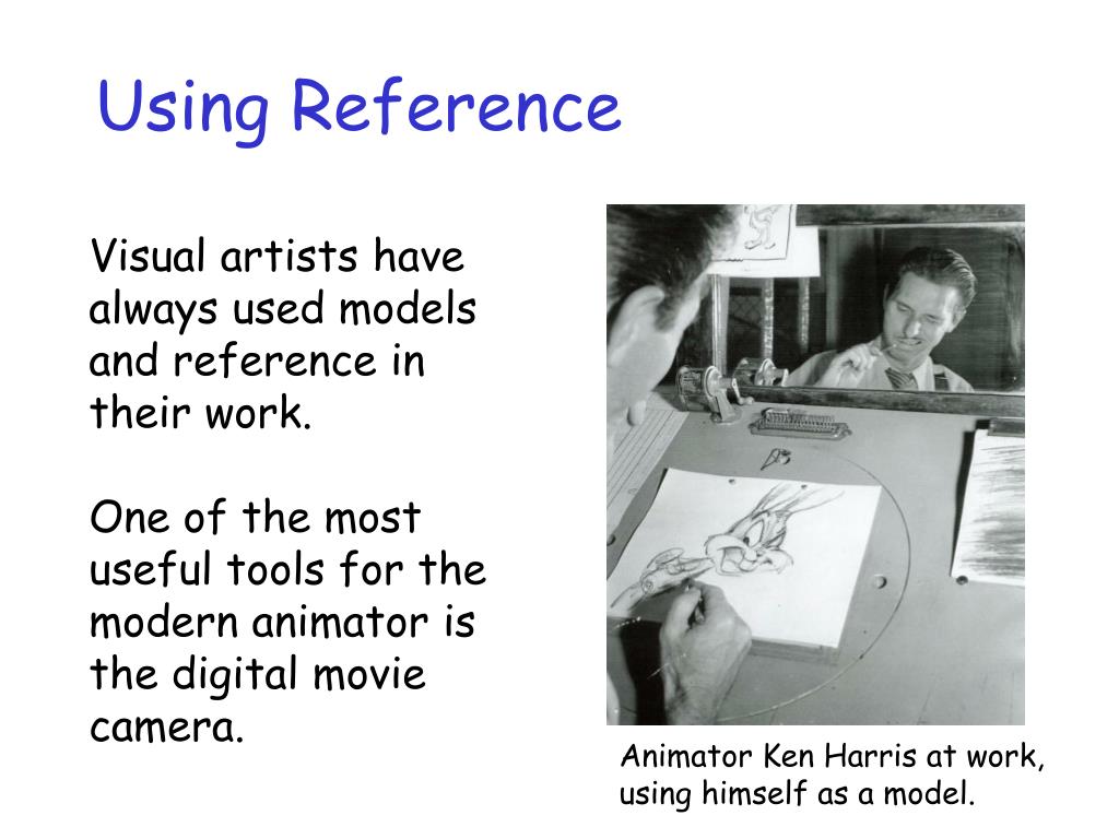 Using Reference Visual artists have always used models and reference in their work. One of the most useful tools for the modern animator is the digital movie camera. Animator Ken Harris at work, using himself as a model.