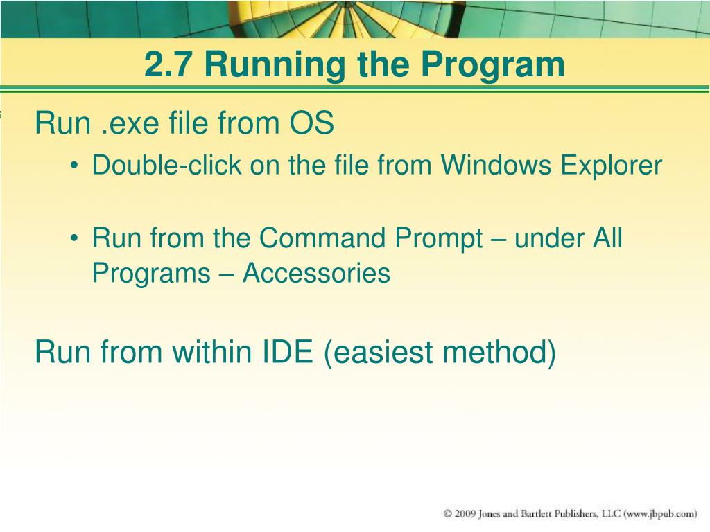 2.7 Running the Program • Run .exe file from OS • Double-click on the file from Windows Explorer • Run from the Command Prompt – under All Programs – Accessories • Run from within IDE (easiest method)