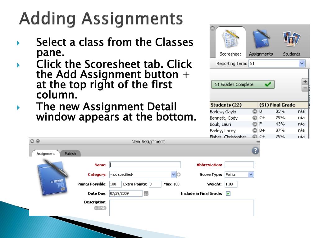 Adding Assignments • Select a class from the Classes pane. • Click the Scoresheet tab. Click the Add Assignment button + at the top right of the first column. • The new Assignment Detail window appears at the bottom.
