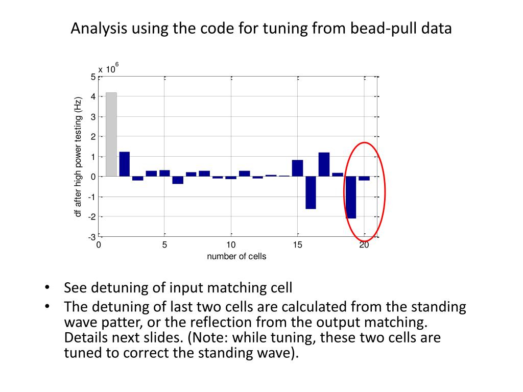 Analysis using the code for tuning from bead-pull data • See detuning of input matching cell • The detuning of last two cells are calculated from the standing wave patter, or the reflection from the output matching. Details next slides. (Note: while tuning, these two cells are tuned to correct the standing wave).