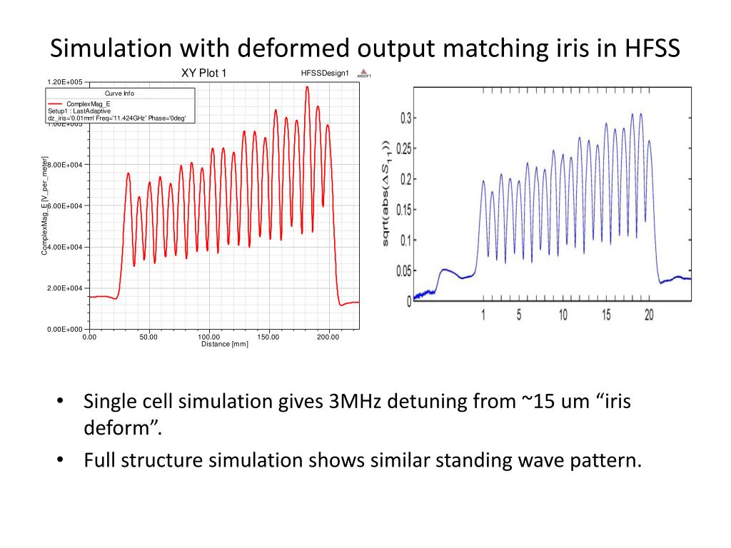 Simulation with deformed output matching iris in HFSS • Single cell simulation gives 3MHz detuning from ~15 um “iris deform”. • Full structure simulation shows similar standing wave pattern.