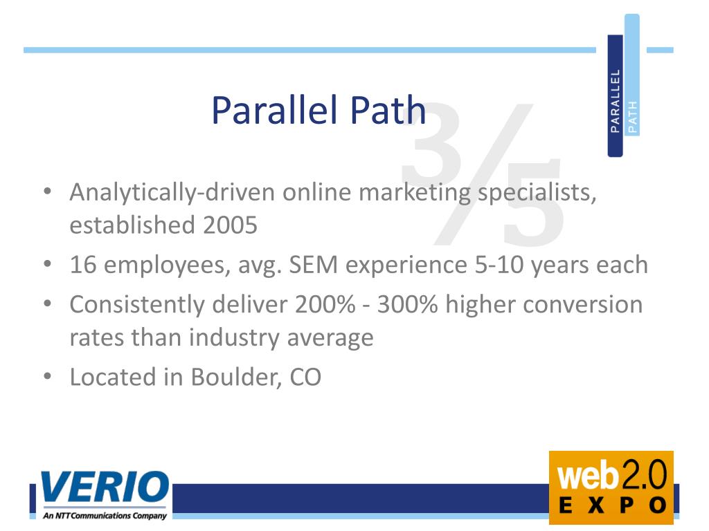 Parallel Path ⅗ • Analytically-driven online marketing specialists, established 2005 • 16 employees, avg. SEM experience 5-10 years each • Consistently deliver 200% - 300% higher conversion rates than industry average • Located in Boulder, CO