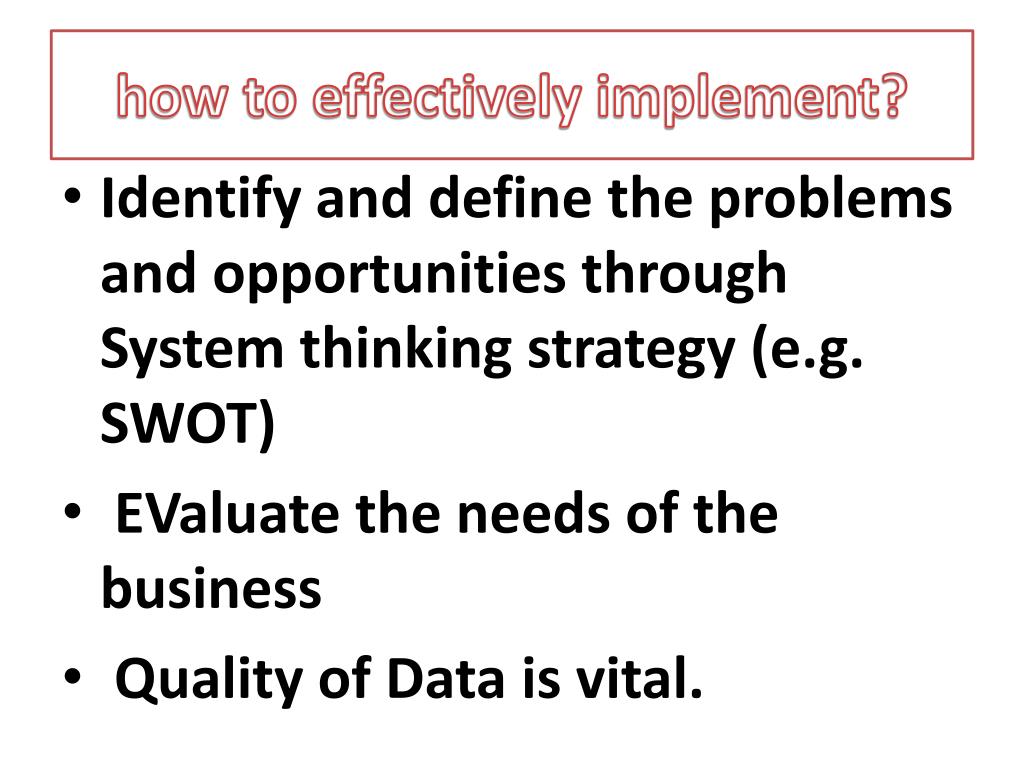 how to effectively implement? • Identify and define the problems and opportunities through System thinking strategy (e.g. SWOT) • EValuate the needs of the business • Quality of Data is vital.