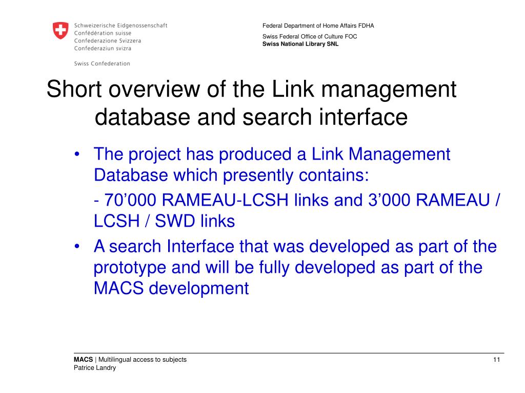 Short overview of the Link management database and search interface • The project has produced a Link Management Database which presently contains: - 70’000 RAMEAU-LCSH links and 3’000 RAMEAU / LCSH / SWD links • A search Interface that was developed as part of the prototype and will be fully developed as part of the MACS development