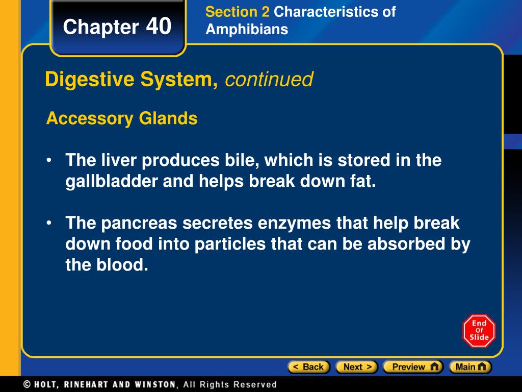 Section 2 Characteristics of Amphibians Chapter 40 Digestive System, continued Accessory Glands • The liver produces bile, which is stored in the gallbladder and helps break down fat. • The pancreas secretes enzymes that help break down food into particles that can be absorbed by the blood.