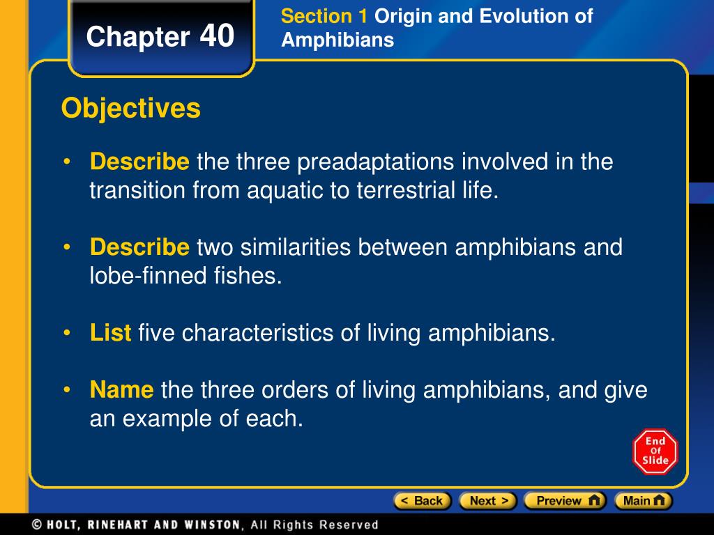 Chapter 40 Amphibians Table of Contents Section 1 Origin and Evolution of Amphibians Section 2 Characteristics of Amphibians Section 3 Reproduction in Amphibians