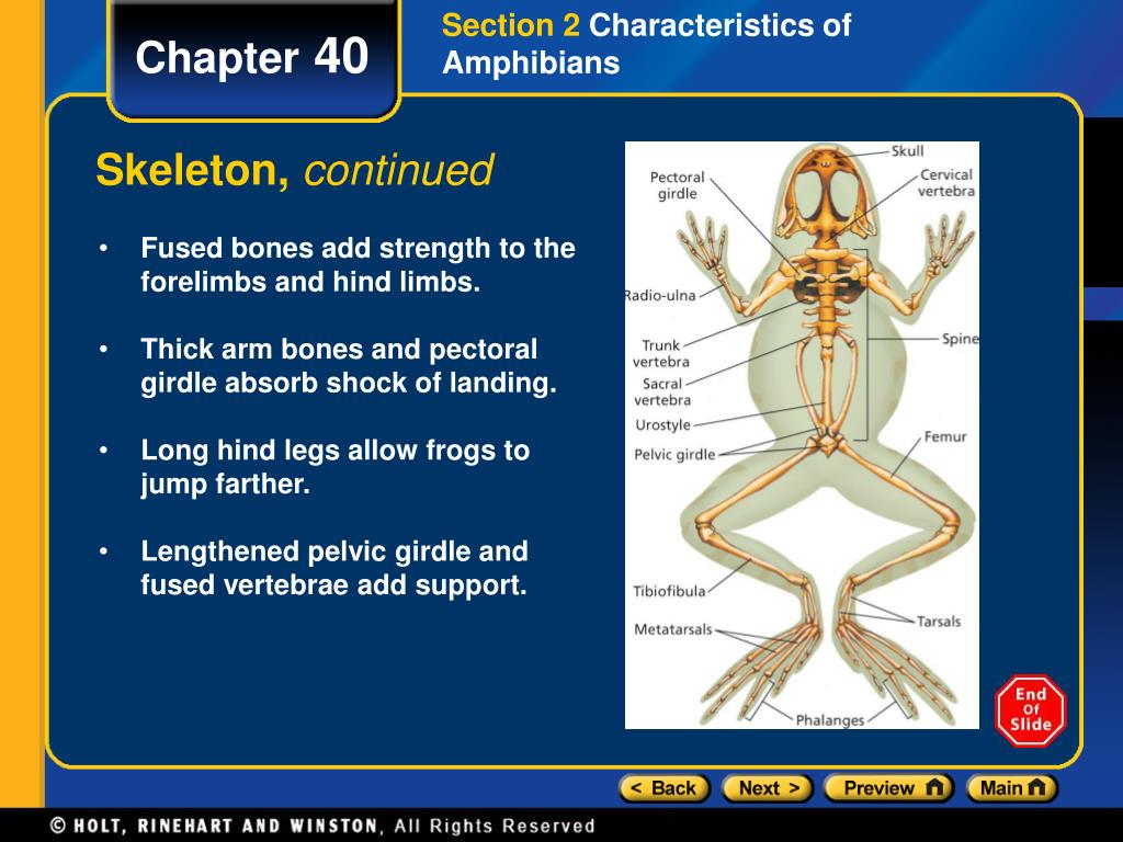 Section 2 Characteristics of Amphibians Chapter 40 Skeleton, continued • Fused bones add strength to the forelimbs and hind limbs. • Thick arm bones and pectoral girdle absorb shock of landing. • Long hind legs allow frogs to jump farther. • Lengthened pelvic girdle and fused vertebrae add support.