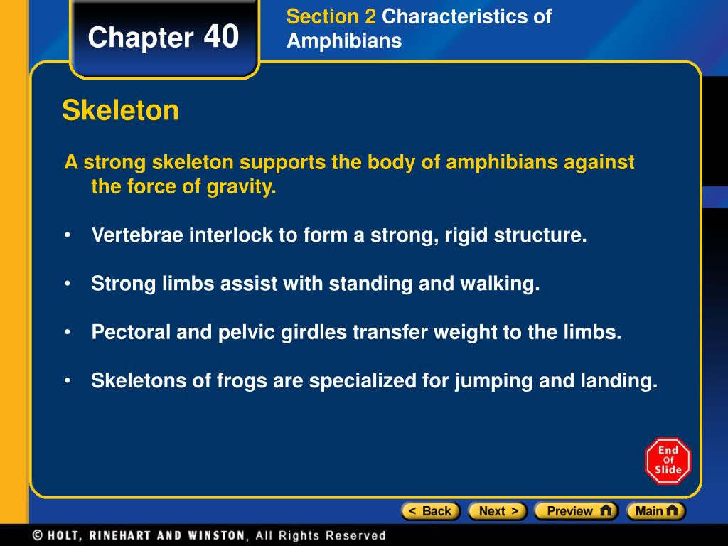 Section 2 Characteristics of Amphibians Chapter 40 Skeleton A strong skeleton supports the body of amphibians against the force of gravity. • Vertebrae interlock to form a strong, rigid structure. • Strong limbs assist with standing and walking. • Pectoral and pelvic girdles transfer weight to the limbs. • Skeletons of frogs are specialized for jumping and landing.