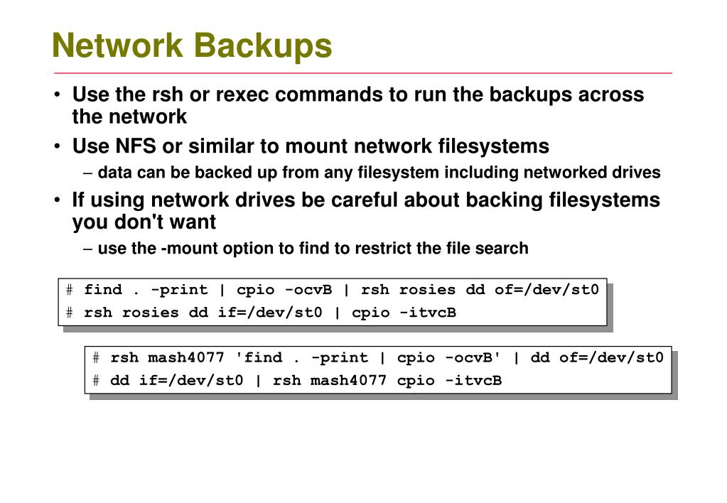 Network Backups • Use the rsh or rexec commands to run the backups across the network • Use NFS or similar to mount network filesystems • data can be backed up from any filesystem including networked drives • If using network drives be careful about backing filesystems you don't want • use the -mount option to find to restrict the file search # find . -print | cpio -ocvB | rsh rosies dd of=/dev/st0 # rsh rosies dd if=/dev/st0 | cpio -itvcB # rsh mash4077 'find . -print | cpio -ocvB' | dd of=/dev/st0 # dd if=/dev/st0 | rsh mash4077 cpio -itvcB