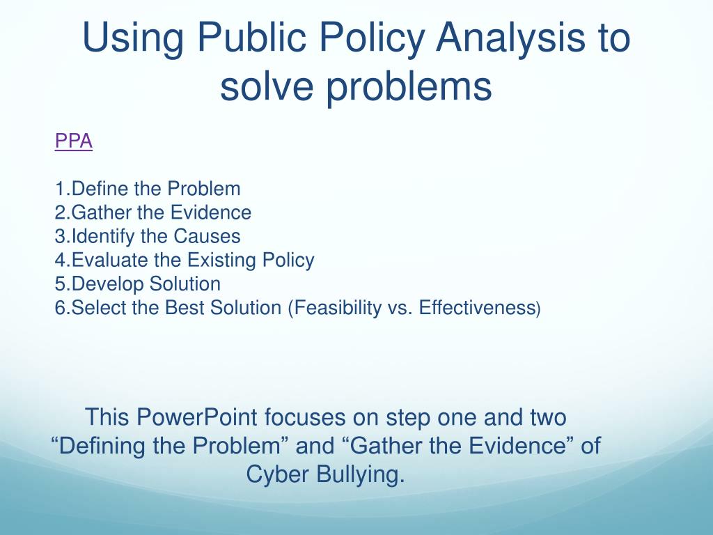 Using Public Policy Analysis to solve problems • PPA • Define the Problem • Gather the Evidence • Identify the Causes • Evaluate the Existing Policy • Develop Solution • Select the Best Solution (Feasibility vs. Effectiveness) • This PowerPoint focuses on step one and two “Defining the Problem” and “Gather the Evidence” of Cyber Bullying.