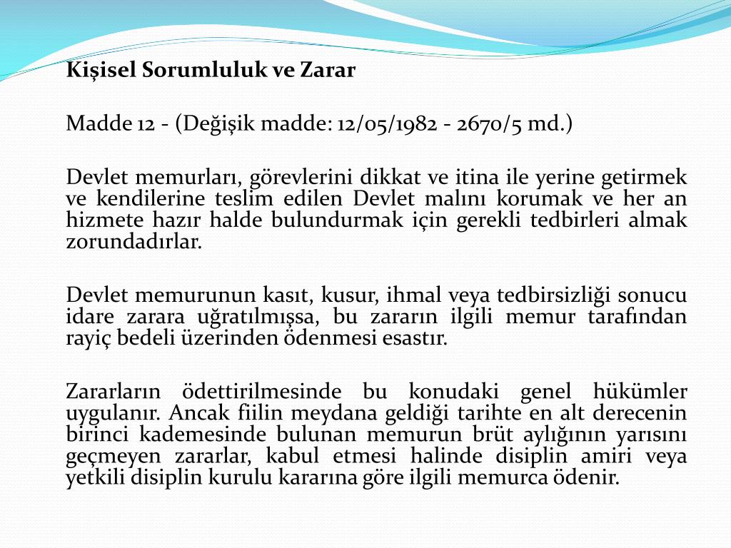 Kişisel Sorumluluk ve Zarar Madde 12 - (Değişik madde: 12/05/1982 - 2670/5 md.) Devlet memurları, görevlerini dikkat ve itina ile yerine getirmek ve kendilerine teslim edilen Devlet malını korumak ve her an hizmete hazır halde bulundurmak için gerekli tedbirleri almak zorundadırlar. Devlet memurunun kasıt, kusur, ihmal veya tedbirsizliği sonucu idare zarara uğratılmışsa, bu zararın ilgili memur tarafından rayiç bedeli üzerinden ödenmesi esastır. Zararların ödettirilmesinde bu konudaki genel hükümler uygulanır. Ancak fiilin meydana geldiği tarihte en alt derecenin birinci kademesinde bulunan memurun brüt aylığının yarısını geçmeyen zararlar, kabul etmesi halinde disiplin amiri veya yetkili disiplin kurulu kararına göre ilgili memurca ödenir.