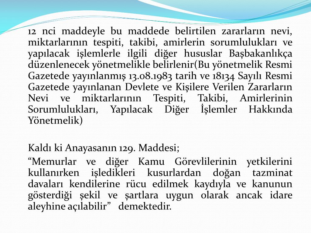 12 nci maddeyle bu maddede belirtilen zararların nevi, miktarlarının tespiti, takibi, amirlerin sorumlulukları ve yapılacak işlemlerle ilgili diğer hususlar Başbakanlıkça düzenlenecek yönetmelikle belirlenir(Bu yönetmelik Resmi Gazetede yayınlanmış 13.08.1983 tarih ve 18134 Sayılı Resmi Gazetede yayınlanan Devlete ve Kişilere Verilen Zararların Nevi ve miktarlarının Tespiti, Takibi, Amirlerinin Sorumlulukları, Yapılacak Diğer İşlemler Hakkında Yönetmelik) Kaldı ki Anayasanın 129. Maddesi; “Memurlar ve diğer Kamu Görevlilerinin yetkilerini kullanırken işledikleri kusurlardan doğan tazminat davaları kendilerine rücu edilmek kaydıyla ve kanunun gösterdiği şekil ve şartlara uygun olarak ancak idare aleyhine açılabilir” demektedir.