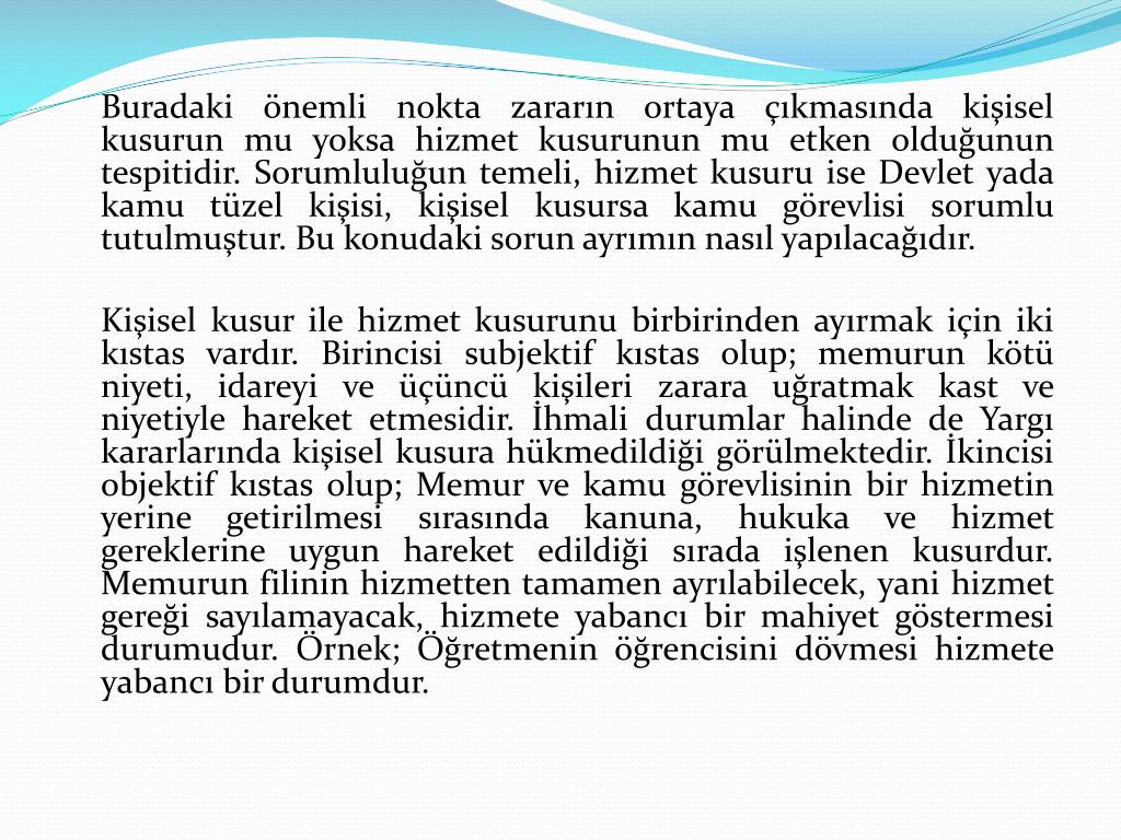 Buradaki önemli nokta zararın ortaya çıkmasında kişisel kusurun mu yoksa hizmet kusurunun mu etken olduğunun tespitidir. Sorumluluğun temeli, hizmet kusuru ise Devlet yada kamu tüzel kişisi, kişisel kusursa kamu görevlisi sorumlu tutulmuştur. Bu konudaki sorun ayrımın nasıl yapılacağıdır. Kişisel kusur ile hizmet kusurunu birbirinden ayırmak için iki kıstas vardır. Birincisi subjektif kıstas olup; memurun kötü niyeti, idareyi ve üçüncü kişileri zarara uğratmak kast ve niyetiyle hareket etmesidir. İhmali durumlar halinde de Yargı kararlarında kişisel kusura hükmedildiği görülmektedir. İkincisi objektif kıstas olup; Memur ve kamu görevlisinin bir hizmetin yerine getirilmesi sırasında kanuna, hukuka ve hizmet gereklerine uygun hareket edildiği sırada işlenen kusurdur. Memurun filinin hizmetten tamamen ayrılabilecek, yani hizmet gereği sayılamayacak, hizmete yabancı bir mahiyet göstermesi durumudur. Örnek; Öğretmenin öğrencisini dövmesi hizmete yabancı bir durumdur.