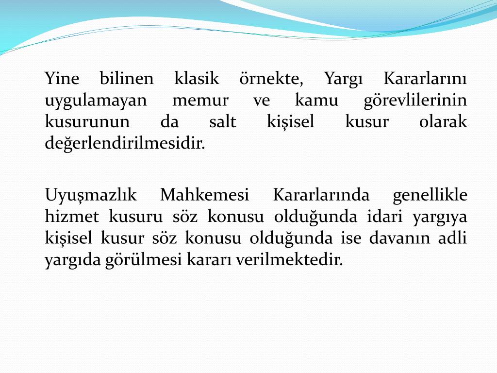 Yine bilinen klasik örnekte, Yargı Kararlarını uygulamayan memur ve kamu görevlilerinin kusurunun da salt kişisel kusur olarak değerlendirilmesidir. Uyuşmazlık Mahkemesi Kararlarında genellikle hizmet kusuru söz konusu olduğunda idari yargıya kişisel kusur söz konusu olduğunda ise davanın adli yargıda görülmesi kararı verilmektedir.