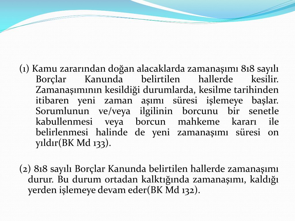 (1) Kamu zararından doğan alacaklarda zamanaşımı 818 sayılı Borçlar Kanunda belirtilen hallerde kesilir. Zamanaşımının kesildiği durumlarda, kesilme tarihinden itibaren yeni zaman aşımı süresi işlemeye başlar. Sorumlunun ve/veya ilgilinin borcunu bir senetle kabullenmesi veya borcun mahkeme kararı ile belirlenmesi halinde de yeni zamanaşımı süresi on yıldır(BK Md 133). (2) 818 sayılı Borçlar Kanunda belirtilen hallerde zamanaşımı durur. Bu durum ortadan kalktığında zamanaşımı, kaldığı yerden işlemeye devam eder(BK Md 132).