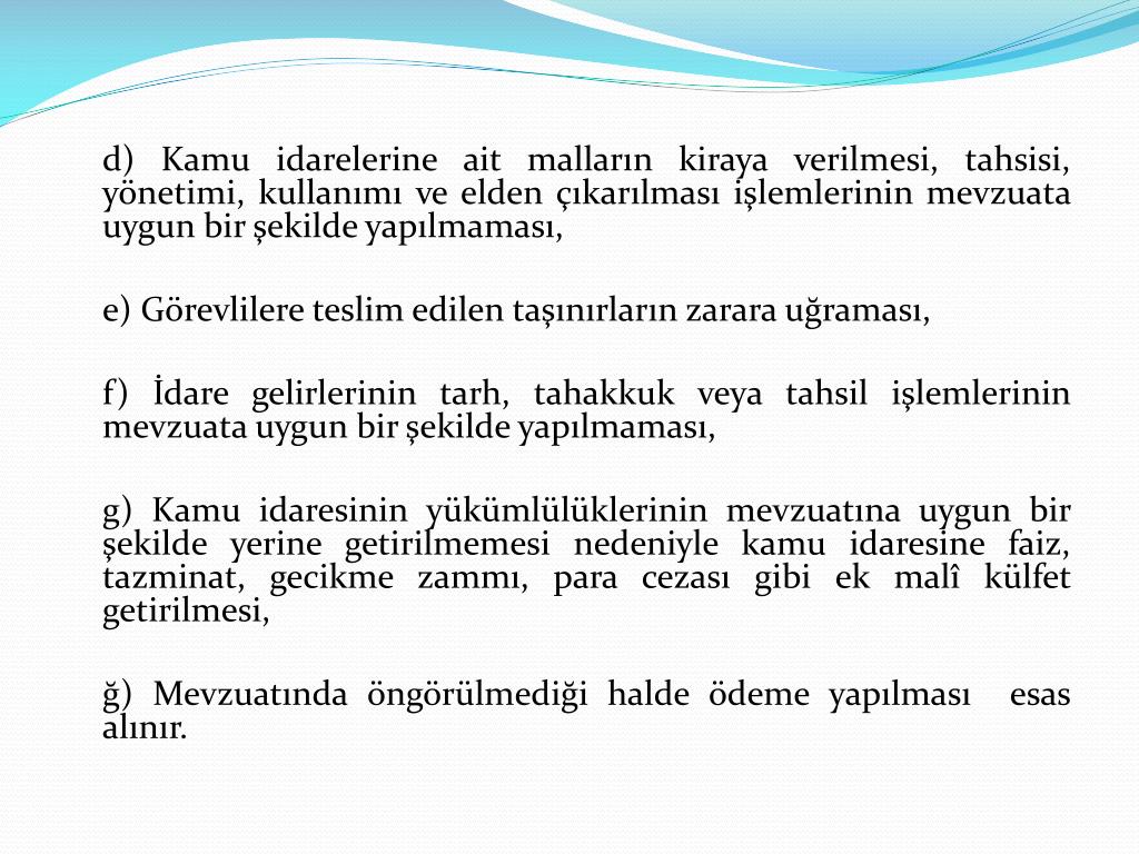 d) Kamu idarelerine ait malların kiraya verilmesi, tahsisi, yönetimi, kullanımı ve elden çıkarılması işlemlerinin mevzuata uygun bir şekilde yapılmaması, e) Görevlilere teslim edilen taşınırların zarara uğraması, f)İdare gelirlerinin tarh, tahakkuk veya tahsil işlemlerinin mevzuata uygun bir şekilde yapılmaması, g) Kamu idaresinin yükümlülüklerinin mevzuatına uygun bir şekilde yerine getirilmemesi nedeniyle kamu idaresine faiz, tazminat, gecikme zammı, para cezası gibi ek malî külfet getirilmesi, ğ) Mevzuatında öngörülmediği halde ödeme yapılması esas alınır.