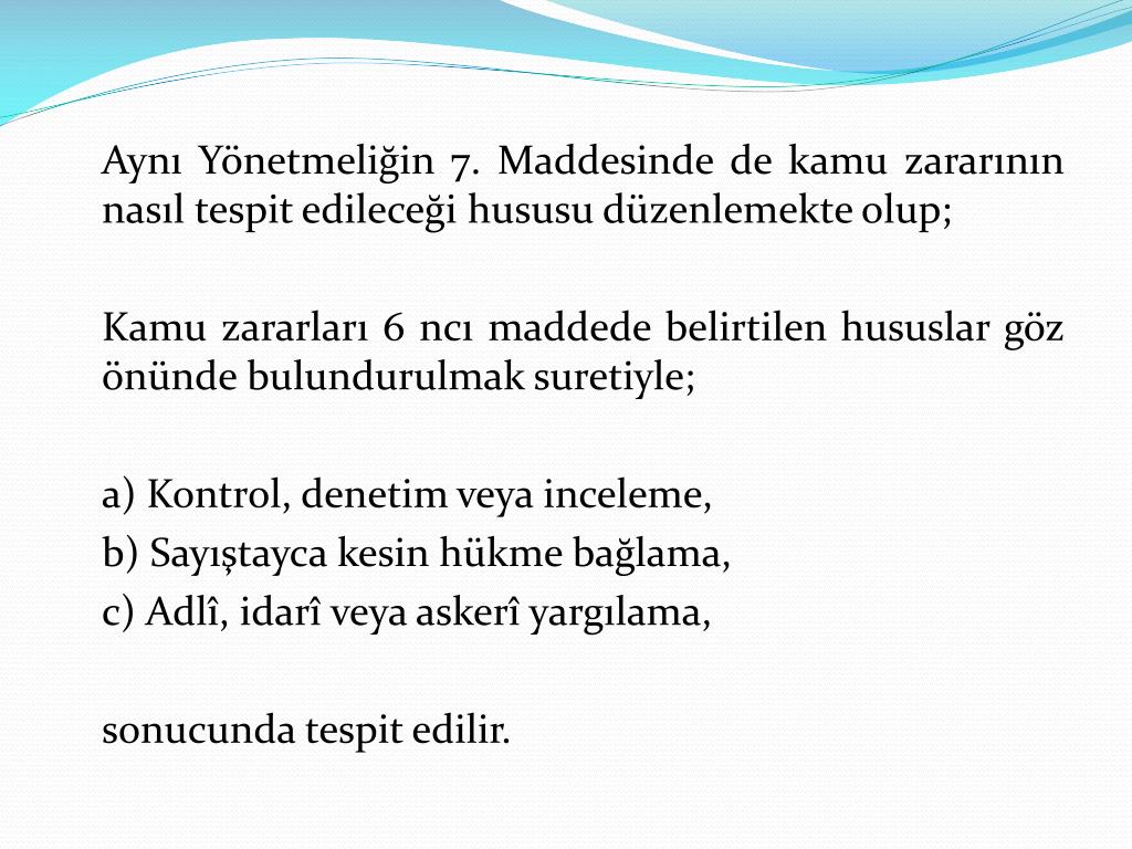 Aynı Yönetmeliğin 7. Maddesinde de kamu zararının nasıl tespit edileceği hususu düzenlemekte olup; Kamu zararları 6 ncı maddede belirtilen hususlar göz önünde bulundurulmak suretiyle; a)Kontrol, denetim veya inceleme, b) Sayıştayca kesin hükme bağlama, c)Adlî, idarî veya askerî yargılama, sonucunda tespit edilir.