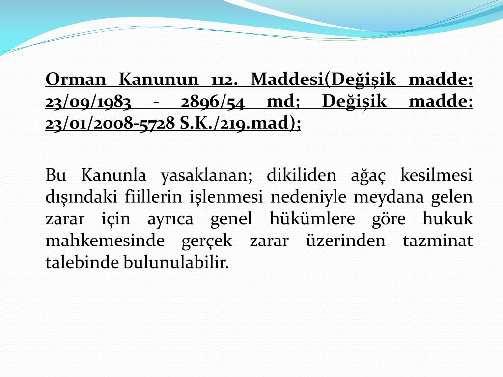 Orman Kanunun 112. Maddesi(Değişik madde: 23/09/1983 - 2896/54 md; Değişik madde: 23/01/2008-5728 S.K./219.mad); Bu Kanunla yasaklanan; dikiliden ağaç kesilmesi dışındaki fiillerin işlenmesi nedeniyle meydana gelen zarar için ayrıca genel hükümlere göre hukuk mahkemesinde gerçek zarar üzerinden tazminat talebinde bulunulabilir.