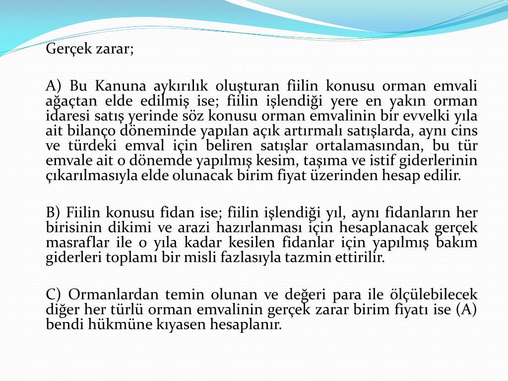 Gerçek zarar; A) Bu Kanuna aykırılık oluşturan fiilin konusu orman emvali ağaçtan elde edilmiş ise; fiilin işlendiği yere en yakın orman idaresi satış yerinde söz konusu orman emvalinin bir evvelki yıla ait bilanço döneminde yapılan açık artırmalı satışlarda, aynı cins ve türdeki emval için beliren satışlar ortalamasından, bu tür emvale ait o dönemde yapılmış kesim, taşıma ve istif giderlerinin çıkarılmasıyla elde olunacak birim fiyat üzerinden hesap edilir. B) Fiilin konusu fidan ise; fiilin işlendiği yıl, aynı fidanların her birisinin dikimi ve arazi hazırlanması için hesaplanacak gerçek masraflar ile o yıla kadar kesilen fidanlar için yapılmış bakım giderleri toplamı bir misli fazlasıyla tazmin ettirilir. C) Ormanlardan temin olunan ve değeri para ile ölçülebilecek diğer her türlü orman emvalinin gerçek zarar birim fiyatı ise (A) bendi hükmüne kıyasen hesaplanır.
