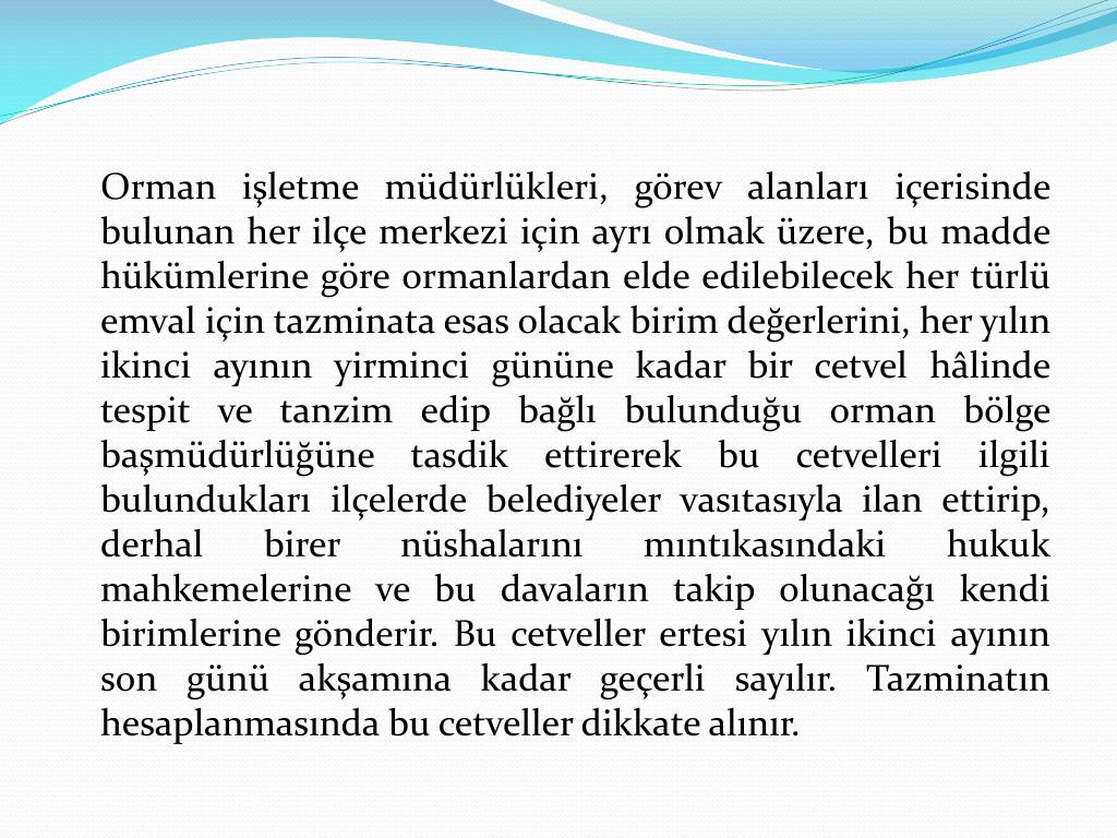 Orman işletme müdürlükleri, görev alanları içerisinde bulunan her ilçe merkezi için ayrı olmak üzere, bu madde hükümlerine göre ormanlardan elde edilebilecek her türlü emval için tazminata esas olacak birim değerlerini, her yılın ikinci ayının yirminci gününe kadar bir cetvel hâlinde tespit ve tanzim edip bağlı bulunduğu orman bölge başmüdürlüğüne tasdik ettirerek bu cetvelleri ilgili bulundukları ilçelerde belediyeler vasıtasıyla ilan ettirip, derhal birer nüshalarını mıntıkasındaki hukuk mahkemelerine ve bu davaların takip olunacağı kendi birimlerine gönderir. Bu cetveller ertesi yılın ikinci ayının son günü akşamına kadar geçerli sayılır. Tazminatın hesaplanmasında bu cetveller dikkate alınır.