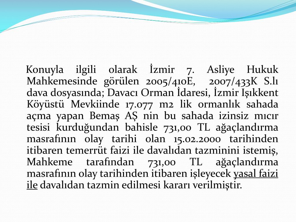 Konuyla ilgili olarak İzmir 7. Asliye Hukuk Mahkemesinde görülen 2005/410E, 2007/433K S.lı dava dosyasında; Davacı Orman İdaresi, İzmir IşıkkentKöyüstü Mevkiinde 17.077 m2 lik ormanlık sahada açma yapan Bemaş AŞ nin bu sahada izinsiz mıcır tesisi kurduğundan bahisle 731,00 TL ağaçlandırma masrafının olay tarihi olan 15.02.2000 tarihinden itibaren temerrüt faizi ile davalıdan tazminini istemiş, Mahkeme tarafından 731,00 TL ağaçlandırma masrafının olay tarihinden itibaren işleyecek yasal faizi ile davalıdan tazmin edilmesi kararı verilmiştir.