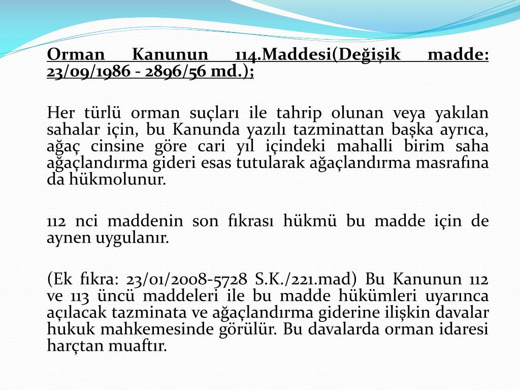 Orman Kanunun 114.Maddesi(Değişik madde: 23/09/1986 - 2896/56 md.); Her türlü orman suçları ile tahrip olunan veya yakılan sahalar için, bu Kanunda yazılı tazminattan başka ayrıca, ağaç cinsine göre cari yıl içindeki mahalli birim saha ağaçlandırma gideri esas tutularak ağaçlandırma masrafına da hükmolunur. 112 nci maddenin son fıkrası hükmü bu madde için de aynen uygulanır. (Ek fıkra: 23/01/2008-5728 S.K./221.mad) Bu Kanunun 112 ve 113 üncü maddeleri ile bu madde hükümleri uyarınca açılacak tazminata ve ağaçlandırma giderine ilişkin davalar hukuk mahkemesinde görülür. Bu davalarda orman idaresi harçtan muaftır.