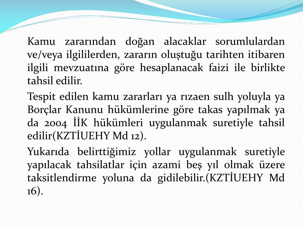 Kamu zararından doğan alacaklar sorumlulardan ve/veya ilgililerden, zararın oluştuğu tarihten itibaren ilgili mevzuatına göre hesaplanacak faizi ile birlikte tahsil edilir. Tespit edilen kamu zararları ya rızaen sulh yoluyla ya Borçlar Kanunu hükümlerine göre takas yapılmak ya da 2004 İİK hükümleri uygulanmak suretiyle tahsil edilir(KZTİUEHY Md 12). Yukarıda belirttiğimiz yollar uygulanmak suretiyle yapılacak tahsilatlar için azami beş yıl olmak üzere taksitlendirme yoluna da gidilebilir.(KZTİUEHY Md 16).
