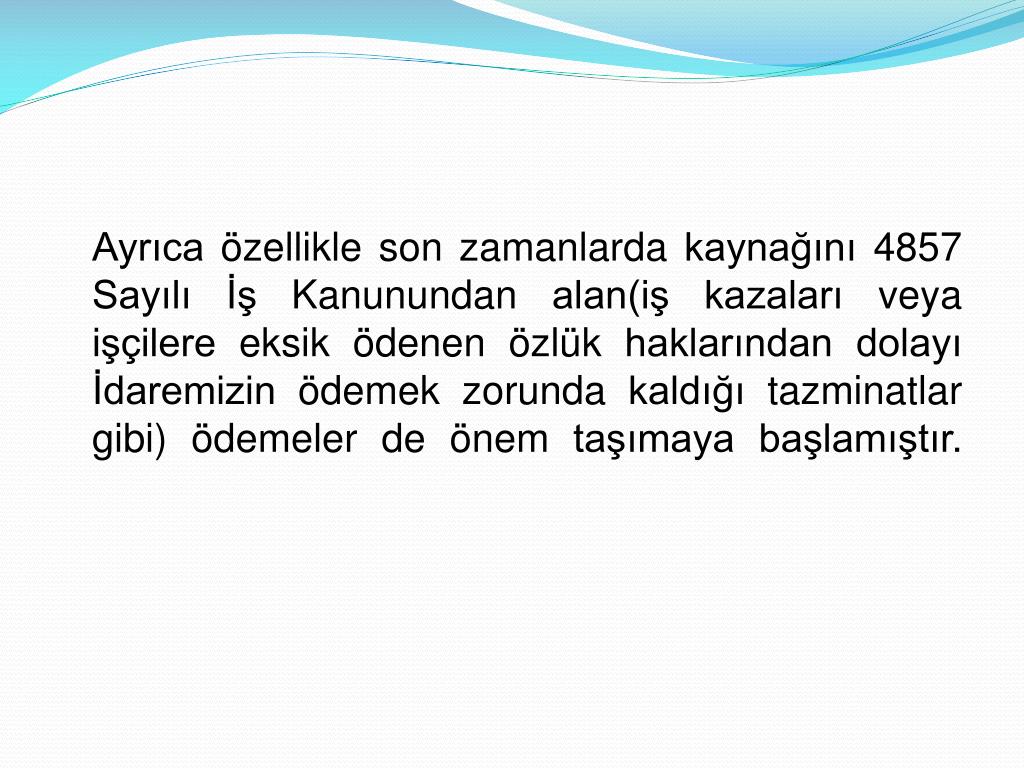 Ayrıca özellikle son zamanlarda kaynağını 4857 Sayılı İş Kanunundan alan(iş kazaları veya işçilere eksik ödenen özlük haklarından dolayı İdaremizin ödemek zorunda kaldığı tazminatlar gibi) ödemeler de önem taşımaya başlamıştır.