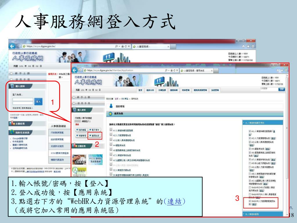 人事服務網登入方式 1 2 1.輸入帳號/密碼,按【登入】 2.登入成功後,按【應用系統】 3.點選右下方的“WebHR人力資源管理系統”的(連結) (或將它加入常用的應用系統區) 3