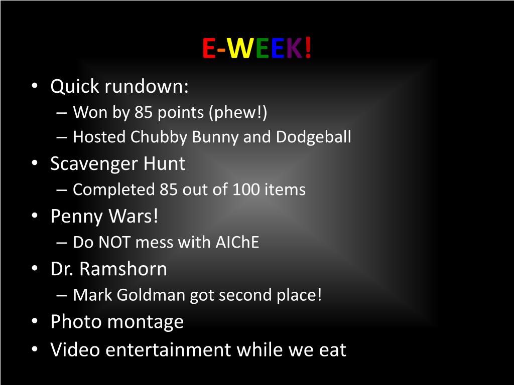 E-WEEK! • Quick rundown: • Won by 85 points (phew!) • Hosted Chubby Bunny and Dodgeball • Scavenger Hunt • Completed 85 out of 100 items • Penny Wars! • Do NOT mess with AIChE • Dr. Ramshorn • Mark Goldman got second place! • Photo montage • Video entertainment while we eat