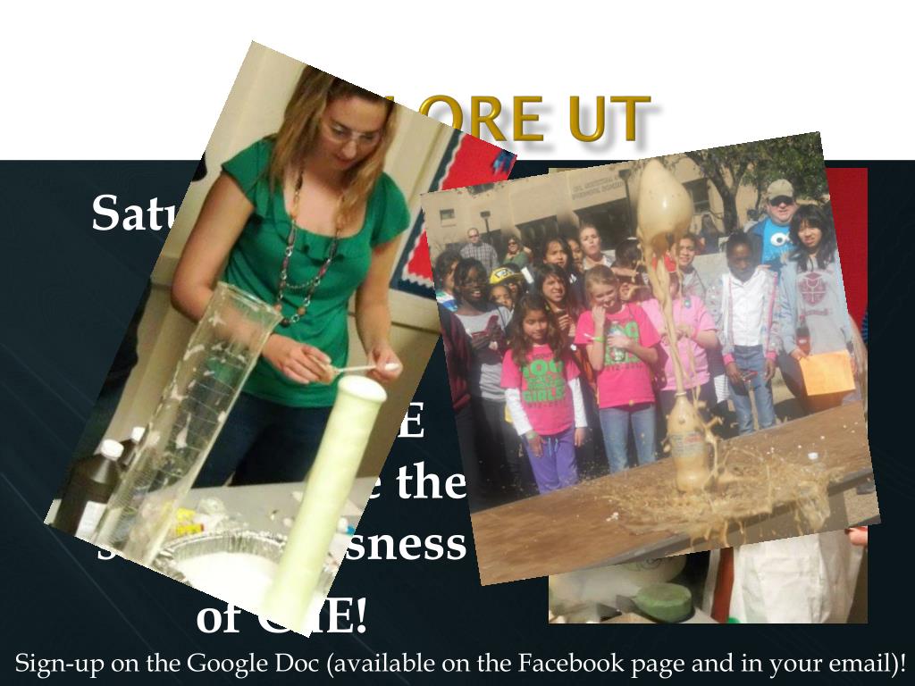 Explore UT Saturday, March 2nd 10am-4pm Help AIChE demonstrate the stupendousness of ChE! Sign-up on the Google Doc (available on the Facebook page and in your email)!