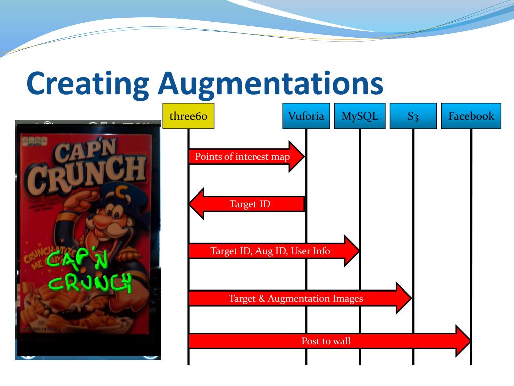 Creating Augmentations three60 Vuforia MySQL S3 Facebook Points of interest map Target ID Target ID, Aug ID, User Info Target & Augmentation Images Post to wall